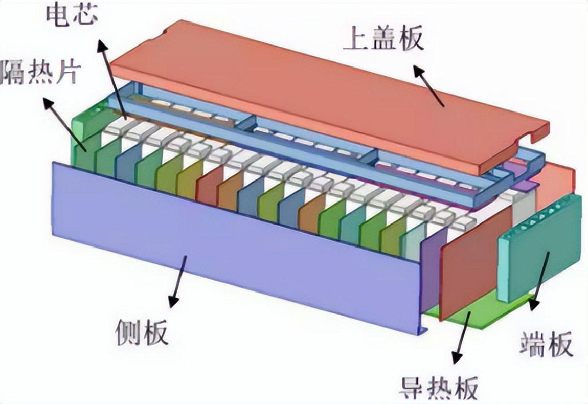 目前动力电池系统热失控的研究,主要侧重于由单体电芯热失控触发继而传播到整个电池包的热失控安全问题方面,单体电芯的热失控是整个电池包热失控的源头,目前唯一的热防护方式是在电芯间增加隔热层,以阻断热失控从失控单体电芯向周围电芯传播,来降低电池包的损坏和其他破坏作用。上图为动力电池模组简化图。