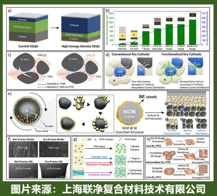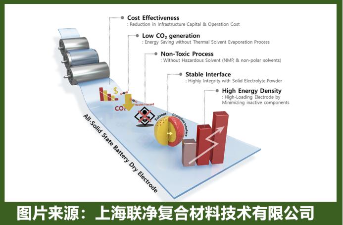 上海联净在粘结剂方面同样有所创新,其开发的 PTFE 改性树脂,成本大幅低于现有湿法工艺中的 PVDF,并且通过复合黏结剂技术,将 PTFE 与离子导电聚合物复合,在纤维化过程中同步构建锂离子通道,降低界面阻抗,有效解决了粘结剂在离子传导方面的问题。